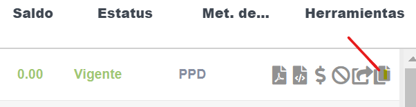 Dentro de (Mis Documentos Emitidos) solamente tienes que hacer clic en el siguiente botón de alguna de tus emisiones previas, la factura de duplicará para que no tengas que capturar los datos nuevamente y podrás hacer modificaciones antes de timbrarla.