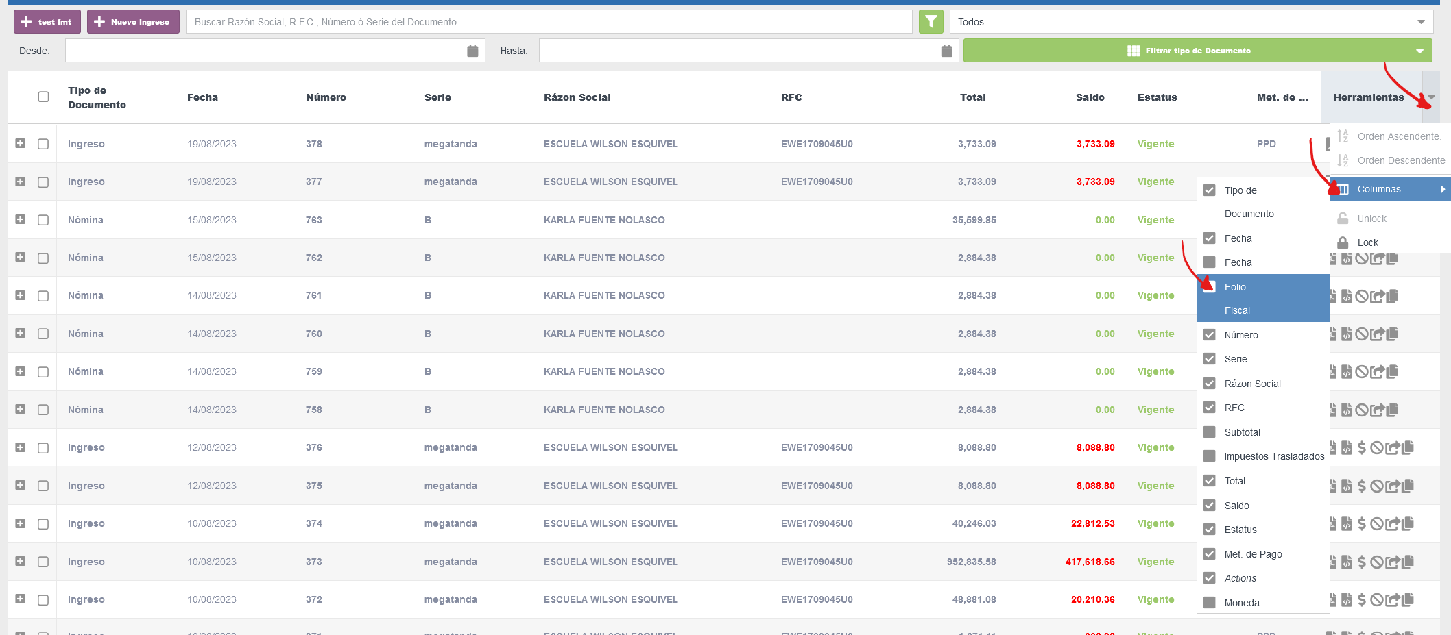 Ajusta que es lo que necesitas ver en tus documentos emitidos o recibidos para agilizar tu trabajo. Puedes alterar el grosor de las columnas o elegir cuales deseas ver. Por ejemplo puedes decidir que se vea el folio fiscal o esconderlo según tus preferencias.
