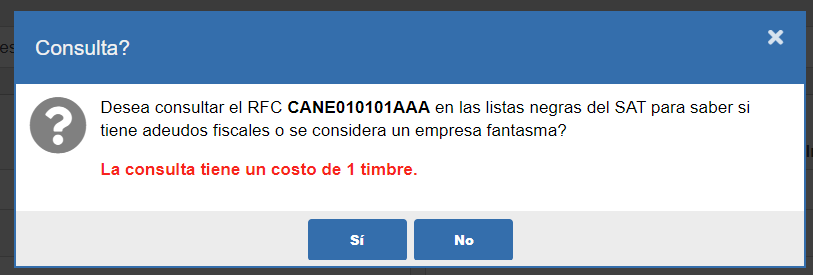 Al guardar a un cliente nuevo el sistema te preguntará si deseas verificarlo, o dentro del panel de control se puede verificar directamente. Los resultados te dirán si el RFC tiene créditos fiscales, se considera no localizable o si es considerado un simulador de operaciones basándose en las listas negras publicadas por la autoridad.